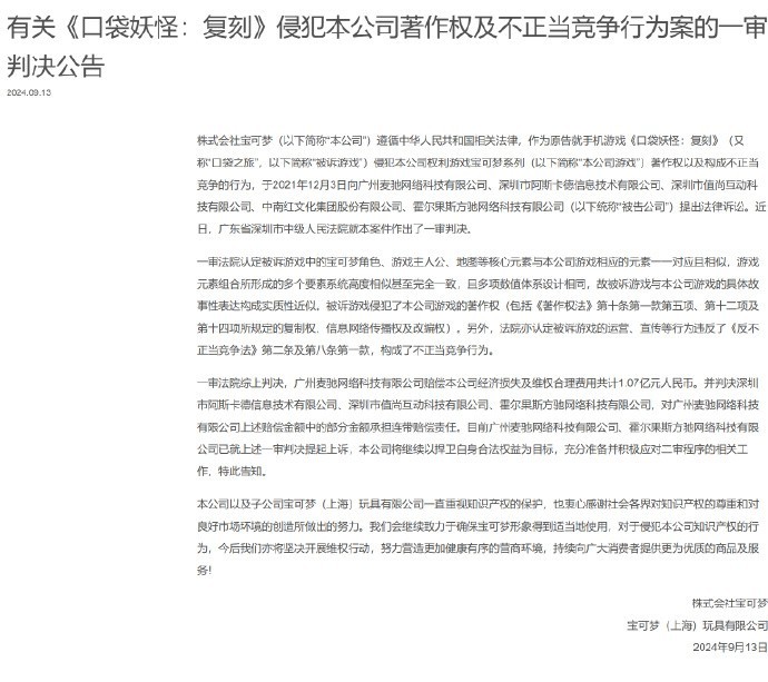 宝可梦起诉山寨游戏案胜诉,将获赔偿金1.07亿元尼古拉约基奇 @懂球帝2024-09-13 16:15《宝可梦》公司于2021年12月3日就手机游戏《口袋妖怪:复刻》侵犯宝可梦系列著作权以及构成不正当竞争的行为提出法律诉讼。近日,广东省深圳市中级人民法院就本案件作出了一审判决,判决广州麦驰网络科技有限公司赔偿经济损失及维权合理费用共计1.07亿元人民币。目前广州麦驰网络科技有限公司、霍尔果斯方驰网络科技有限公司已就上述一审判决提起上诉,《宝可梦》公司将充分准备并积极应对二审程序的相关工作。展开更多