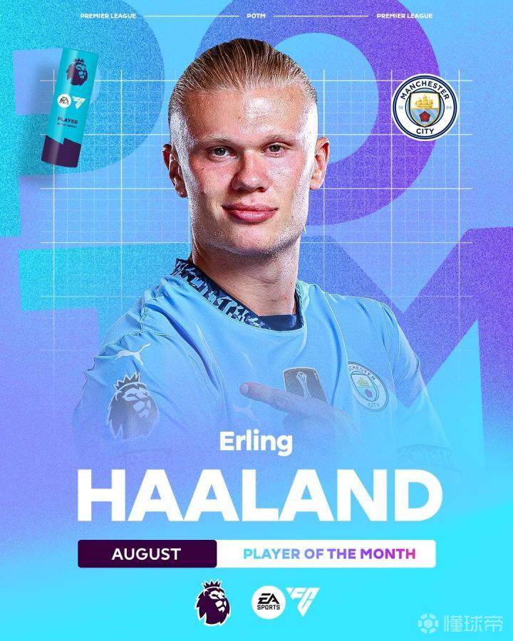 英超官方消息,曼城前锋哈兰德当选EA SPORTS英超8月最佳球员。