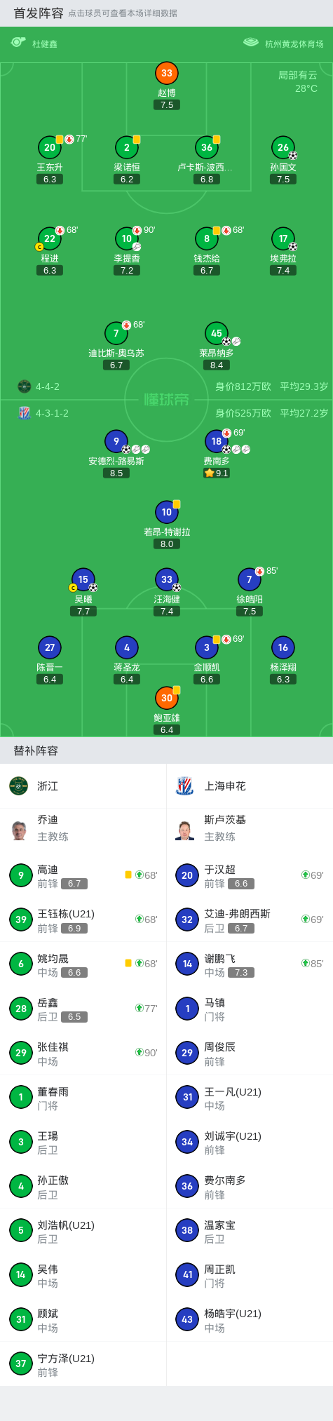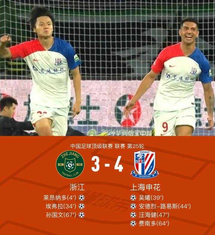北京时间9月13日,中国足球顶级联赛第25轮,浙江队主场迎战上海申花队。上半场,莱昂纳多开场不久抽射破门,李提香精准助攻埃弗拉抽射得手,费南多直塞助攻吴曦单刀推射入网,路易斯单刀破门追平比分;下半场,汪海健低射得手反超比分,路易斯传中助攻费南多打入申花生涯首球,孙国文与莱昂纳多撞墙配合后破门,卢卡斯头球绝平被判埃弗拉犯规在先进球无效。最终上海申花队以4-3的比分险胜浙江队。