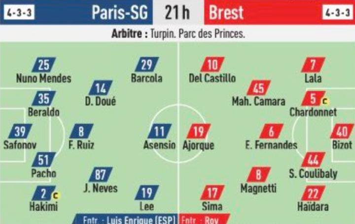 《队报》认为,与国际比赛日前的法甲第3轮比赛相比,此战恩里克会安排李刚仁首发,与阿森西奥和巴尔科拉组成三叉戟,中场位置德西雷-杜埃和法比安-鲁伊斯有望首发,防线上卢卡斯-贝拉尔多回到中卫位置,努诺-门德斯首发出任左后卫。门将位置由于多纳鲁马的孩子出生,俄罗斯国门萨福诺夫有望迎来首秀。