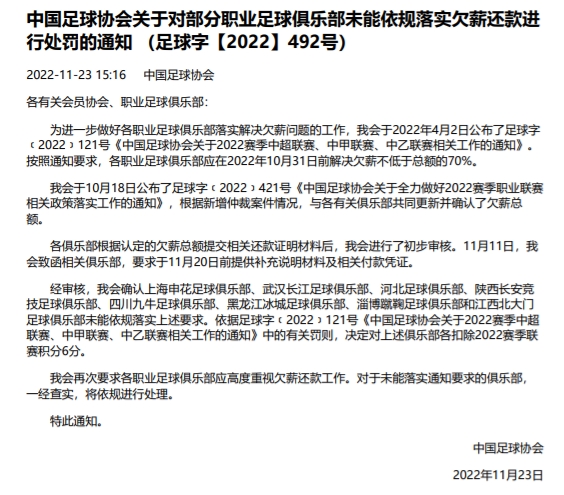 2021年,超过10家以上的中超俱乐部都出现欠薪,中甲中乙球队数量更是难以统计。2022赛季,治理欠薪成为了足球领域的主要工作。由于未能按照进度落实欠薪还款工作,河北俱乐部(2次)、武汉长江(2次)、湖南湘涛、上海申花、陕西长安竞技、四川九牛、黑龙江冰城、淄博蹴鞠和江西北大门等球队先后被中国足协不同程度扣除了联赛积分。