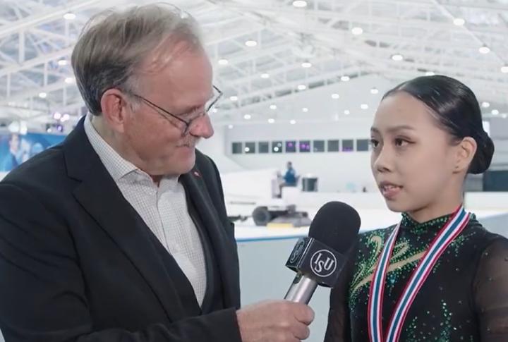 而这也是中国女单选手首夺青年组花滑大奖赛冠军,赛后王一涵用全英文接受了采访。