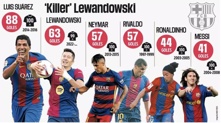 巴萨生涯前百场进球排名:苏牙88球,梅西41球,莱万目前63球
