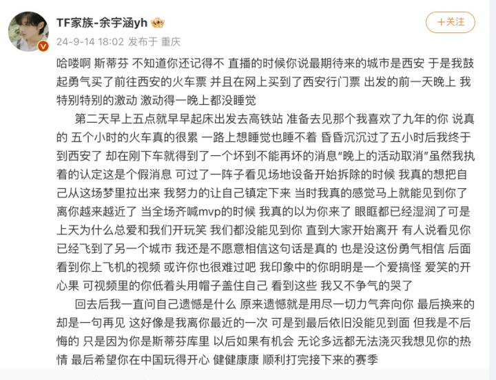 最近,TF家族的余宇涵因为没见到库里更新了个人社交媒体,谈到了自己的感受。值得一提的是,余宇涵这篇微博文章全文没有一个标点符号。