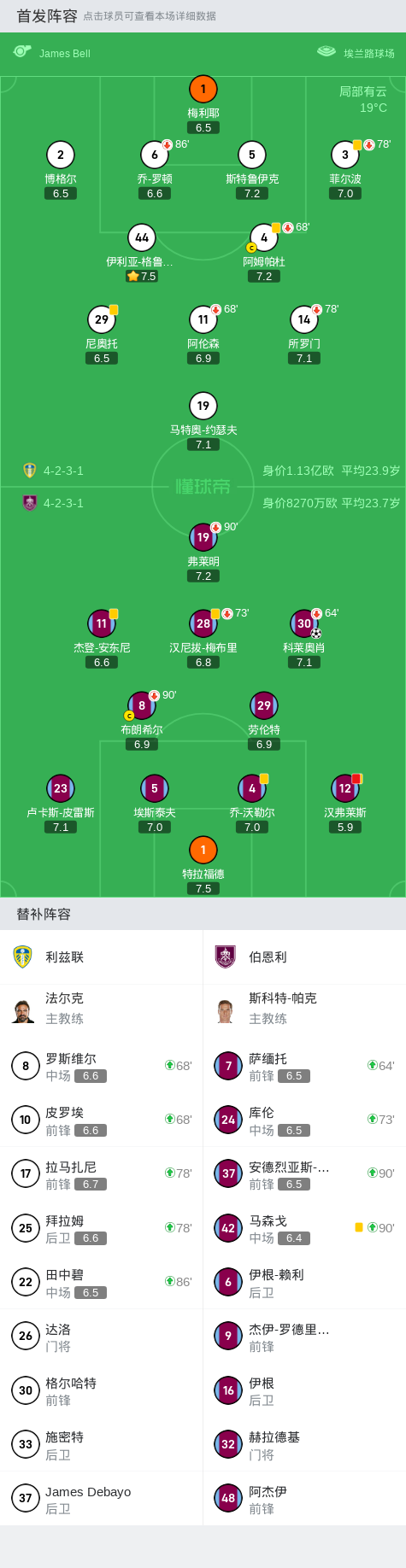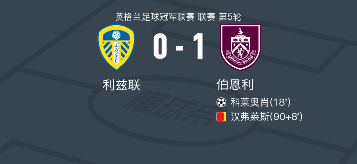 在英格兰足球冠军联赛第5轮的比赛中,利兹联坐镇主场迎战伯恩利。比赛中,伯恩利的科莱奥肖成功破门,为球队取得领先。比赛接近尾声时,伯恩利的汉弗莱斯因累计两张黄牌被罚下场。最终,伯恩利以1-0战胜利兹联,取得了这场比赛的胜利。