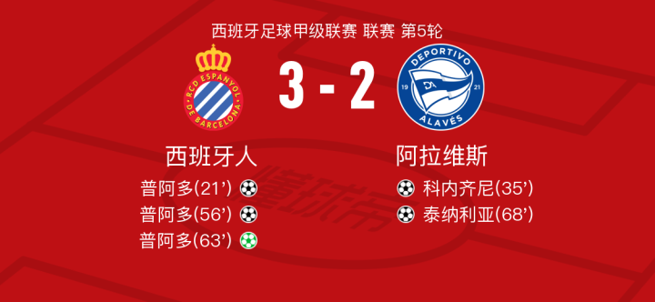 西班牙人vs阿拉维斯球员评分:普阿多8.9分,贝利斯6.2分