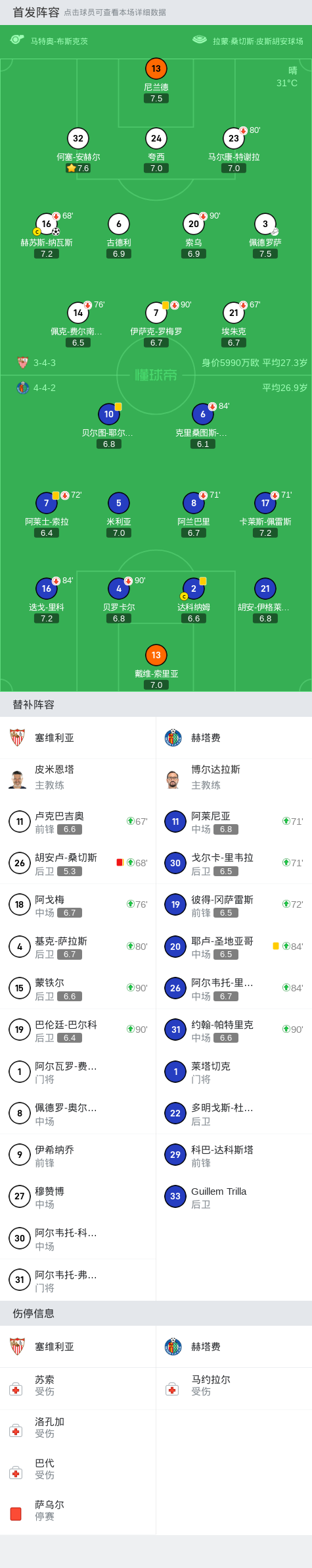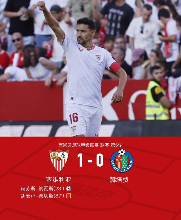 在西班牙足球甲级联赛第5轮的比赛中,塞维利亚主场迎战赫塔费。比赛中,纳瓦斯在佩德罗萨的助攻下成功破门取得领先,桑切斯被判假摔染黄后因累计两张黄牌被罚下场。最终,塞维利亚以1-0战胜赫塔费,取得了这场比赛的胜利。