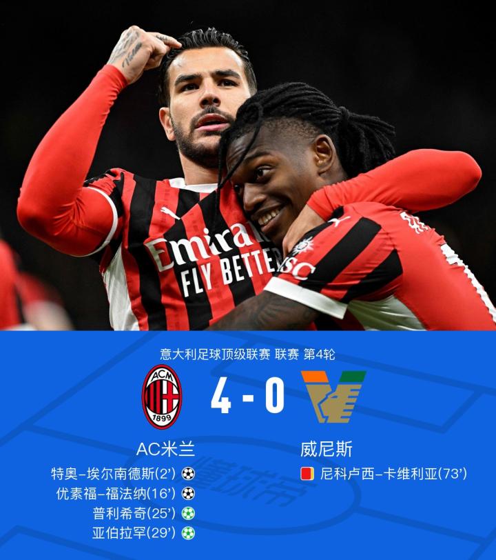 北京时间9月15日,意大利足球顶级联赛第4轮,AC米兰主场迎战威尼斯。开场仅仅90秒,莱奥助攻,特奥闪击破门。普利希奇开出角球,福法纳破门。随后,亚伯拉罕造点,普利希奇主罚命中。莱奥造点,亚伯拉罕一蹴而就。下半场,赞帕诺破门,但是因为卡维利亚踩踏犯规在先被取消,而卡维利亚还因为此次犯规被罚下。全场比赛结束,米兰4-0轻取威尼斯,拿下新赛季意甲联赛首场胜利。