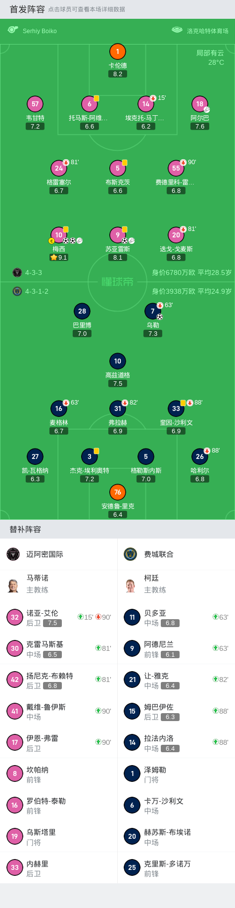 迈阿密国际3-1逆转费城联合,梅西4分钟2球+助攻苏亚雷斯破门