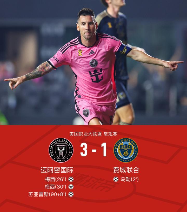 北京时间9月15日,美国职业大联盟常规赛,迈阿密国际主场迎战费城联合。上半场,乌勒开场闪击破门,梅西4分钟连入两球将比分反超,随后梅西越位位置助攻苏亚雷斯破门被吹。下半场,阿德尼兰头球顶高,高兹道格抽射打偏,伤停补时阶段,梅西助攻苏亚雷斯推射破门,最终,迈阿密国际3-1逆转战胜费城联合。
