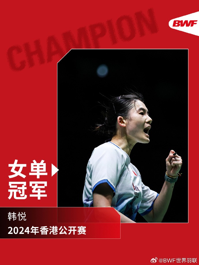 香港羽毛球公开赛:韩悦2-0印尼选手获女单冠军,获赛季首冠绿鱼绿 @懂球帝2024-09-15 17:32北京时间9月15日,2024年中国香港羽毛球公开赛女单决赛,现年24岁的中国选手韩悦以2-0(21-18、21-7)横扫印尼选手瓦尔达尼,收获冠军。这是韩悦职业生涯第四个羽联巡回赛女单冠军,打破时隔11个月的冠军荒。此站赛事,中国羽毛球队只派出韩悦一人出战女单比赛。展开更多