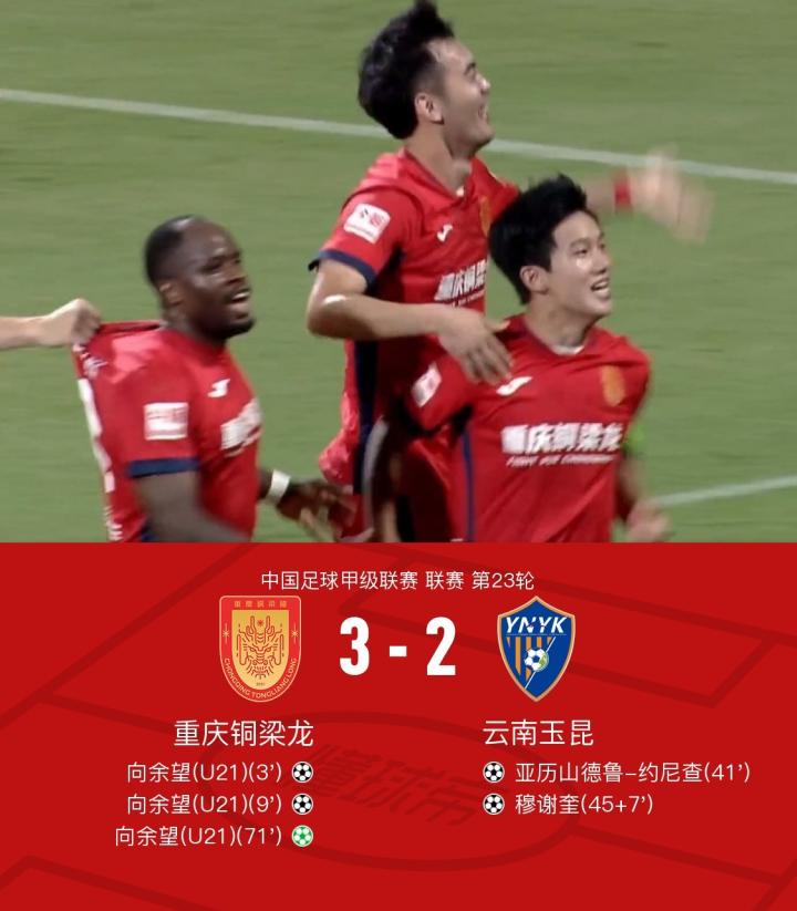 北京时间9月15日,中国足球甲级联赛第23轮,重庆铜梁龙主场迎战云南玉昆。比赛中,向余望开场闪击兜射破门先下一城,随后向余望禁区内又一记凌空低射破门完成梅开二度,半场尾声阶段拉布亚德助攻约尼查破门扳回一城,穆谢奎单刀推射破门将比分追平,下半场拉布亚德禁区内离谱手球送点,向余望操刀点射完成帽子戏法,全场战罢,最终重庆铜梁龙以3-2战胜云南玉昆。