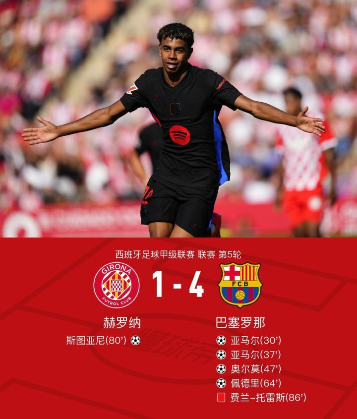 剑南春|巴萨4-1赫罗纳,亚马尔双响,费兰直红,奥尔莫建功