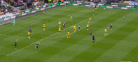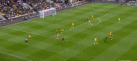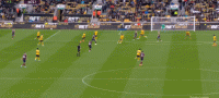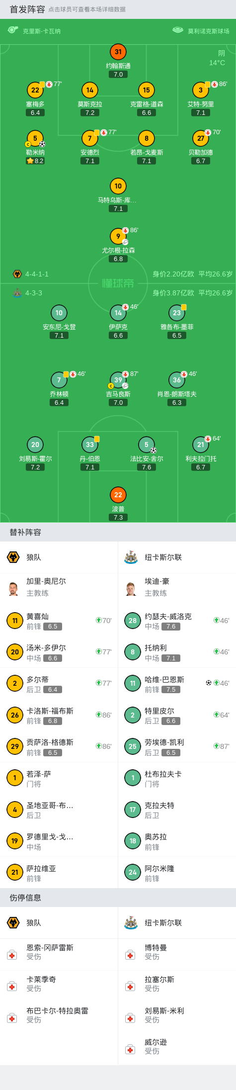 第35分钟,拉森传中,若昂-戈麦斯巧妙一漏,勒米纳推射破门,狼队1-0