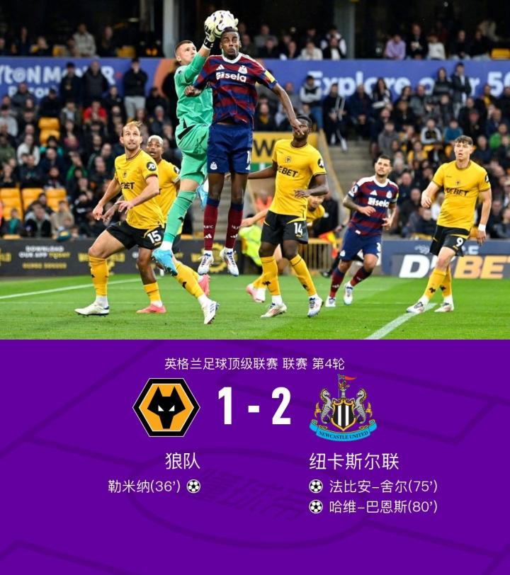 北京时间9月15日23:30,英格兰足球顶级联赛第4轮,狼队主场迎战纽卡斯尔联。上半场,勒米纳率先破门,戈登击中立柱;下半场,法比安-舍尔、哈维-巴恩斯先后轰出世界波直挂死角将比分反超。最终,纽卡斯尔联以2比1战胜狼队。