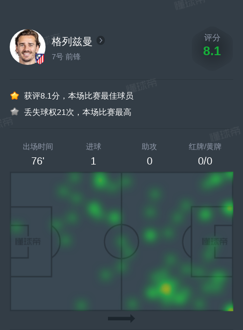 格列兹曼vs瓦伦西亚全场数据:1进球,1次关键传球