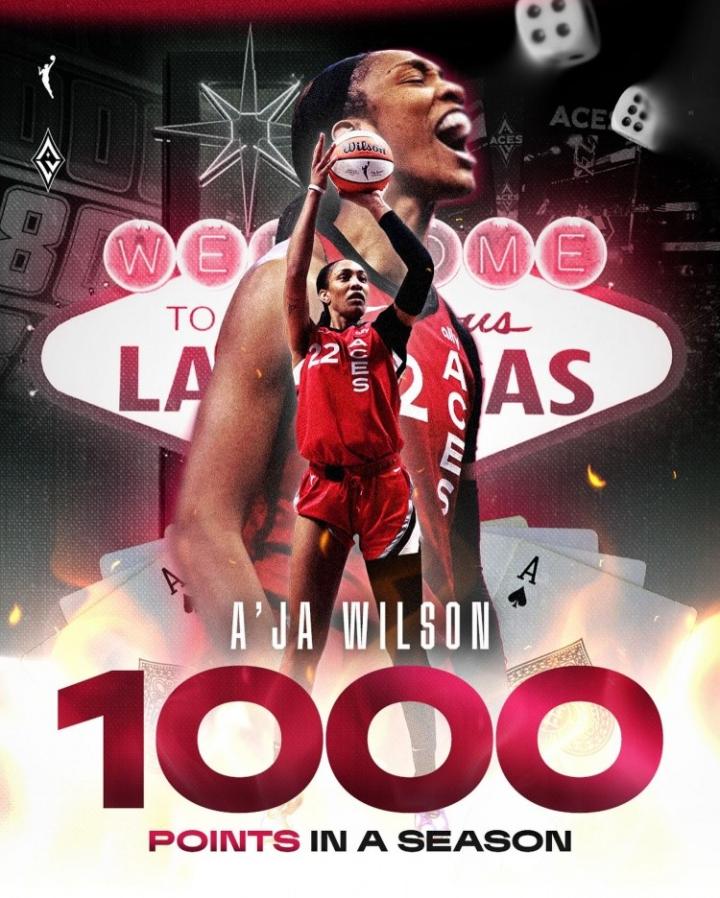 本场比赛结束后,阿贾-威尔逊本赛季WNBA总得分已经达到1000分,成为WNBA历史上首位单赛季得分破千的球员!WNBA常规赛共有40场,这也意味着阿贾-威尔逊还将继续刷新这个记录。