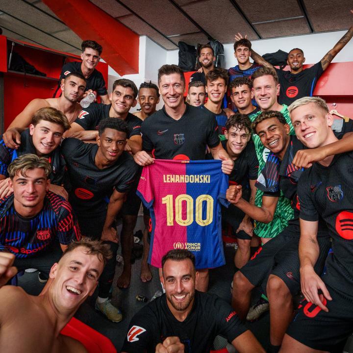 巴萨官方在社交媒体上发帖向莱万表示了祝贺,波兰前锋还在赛后收到了印有100的纪念球衣,并在更衣室与全队合影留念。