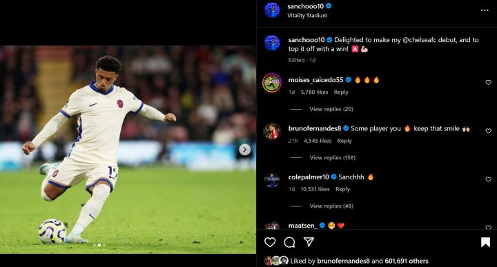 桑乔社媒庆祝切尔西首秀,B费留言:太棒了,保持你的笑容吧