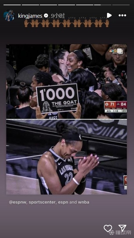勒布朗-詹姆斯赛后更新个人社媒,转发了阿贾-威尔逊得到1000分的图片,配上一排“🙌🏾”的emoji表情向后者表示祝贺。