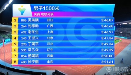 今晚的男子1500米比赛,奚枭横在最后一圈发力,逐渐超过领跑的刘德助并拉开一定差距,最终以3分46秒07夺冠,刘德助以3分46秒68再次屈居亚军。