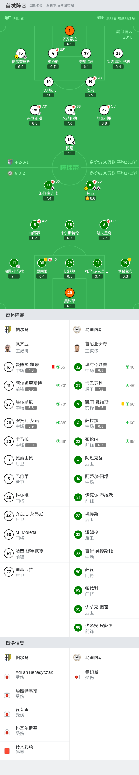 北京时间9月17日意大利足球顶级联赛 联赛 第4轮,帕尔马主场对阵乌迪内斯。帕尔马德尔普拉托破门,博尼破门。乌迪内斯洛伦佐-卢卡破门,托万梅开二度。最终比分帕尔马 2-3 乌迪内斯。