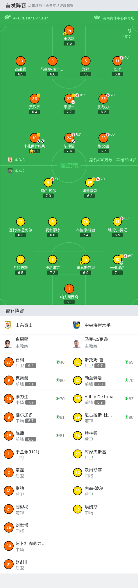 第46分钟,半场换人,石柯换下了刘洋