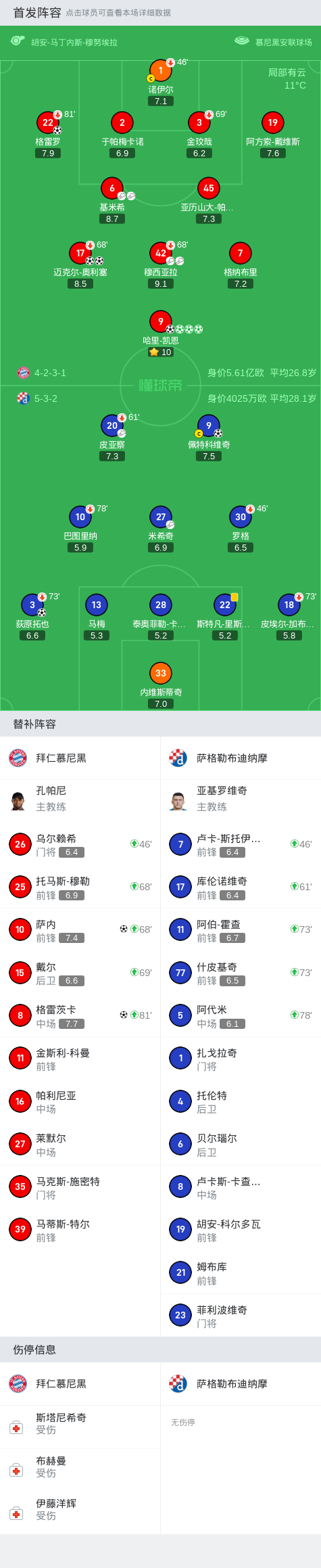 拜仁三获点球9-2萨格勒布迪纳摩,凯恩大四喜,奥利塞双响