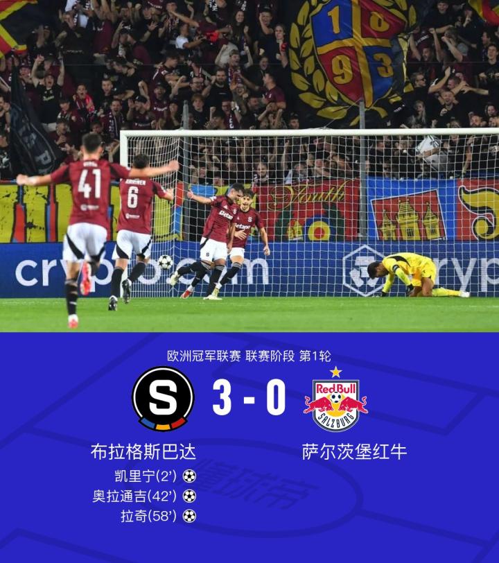 在北京时间9月19日进行的欧洲冠军联赛小组赛首轮比赛中,布拉格斯巴达迎战萨尔茨堡红牛。上半场,凯里宁门前补射破门先拔头筹。穆萨-昆富洛-约越位在先,进球被吹无效。帕纳克助攻奥拉通吉破门将比分扩大。下半场,奥拉通吉助攻,拉奇扣过三名防守队员推空门得手。最终,布拉格斯巴达主场3-0大胜萨尔茨堡红牛。