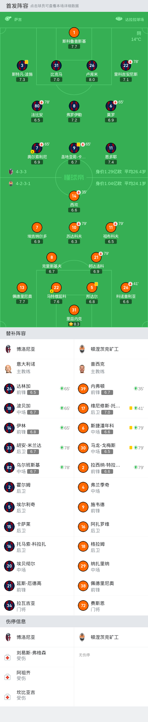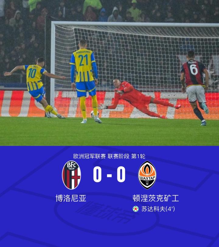 博洛尼亚0-0顿涅茨克矿工,苏达科夫失点