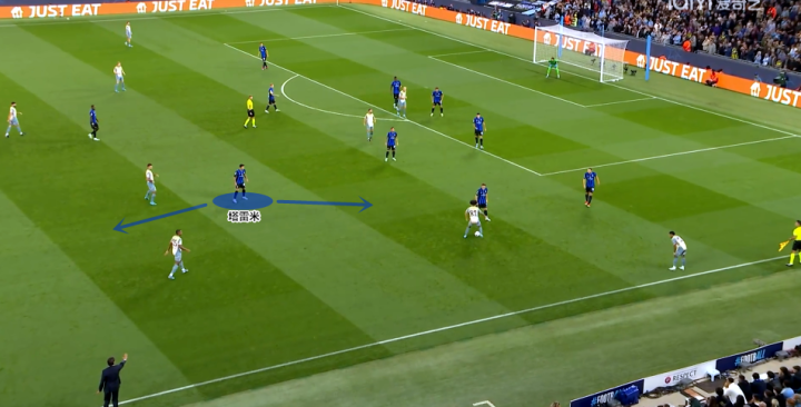 面对曼城的高压逼抢,长时间的被动挨打往往无法善终,挑战者们是否敢于耐心传递,堪称影响比赛走势的关键。自小因扎吉执教以来,国米在传切方面的造诣日趋精进,球员普遍都具备第一时间半转身起球拉开空间的能力,对于通过长球和斜调利用宽度与纵深的理解也很到位。他们在出球阶段的策略是优先选择地面短传,当压力较大时就长传联系前线桥头堡,由小图拉姆、塔雷米和巴雷拉稳住球权,带动身后的队友投入进攻。