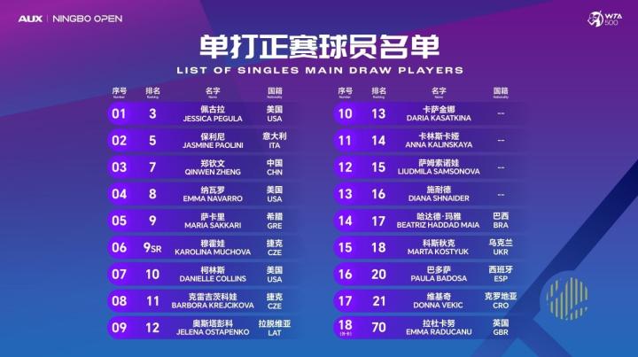 WTA500宁波公开赛参赛阵容:郑钦文领衔,佩古拉等名将在列凡尔赛小木屋 @懂球帝2024-09-19 11:399月19日,2024年WTA宁波公开赛发布参赛阵容,郑钦文领衔,克雷吉茨科娃、佩古拉、鲍里妮、纳瓦罗、维基奇等名将在列。据悉,佩古拉、鲍里妮、纳瓦罗、萨卡里、穆霍娃、柯林斯、克雷吉茨科娃、奥斯塔彭科等球员都已报名,拉杜卡努收获外卡。今年的宁波站级别为WTA500赛事,按照赛程安排,正赛将在10月14日至20日进行。 展开更多