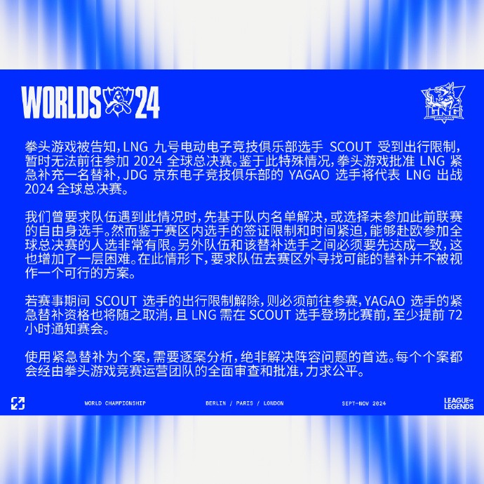 若赛事期间SCOUT选手的出行限制解除,则必须前往参赛,YAGAO选手的紧急替补资格也将随之取消,且LNG需在SCOUT选手登场比赛前,至少提前72小时通知赛会。使用紧急替补为个案,需要逐案分析,绝非解决阵容问题的首选。每个个案都会经由拳头游戏竞赛运营团队的全面审查和批准,力求公平。”