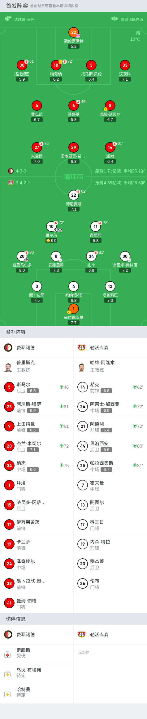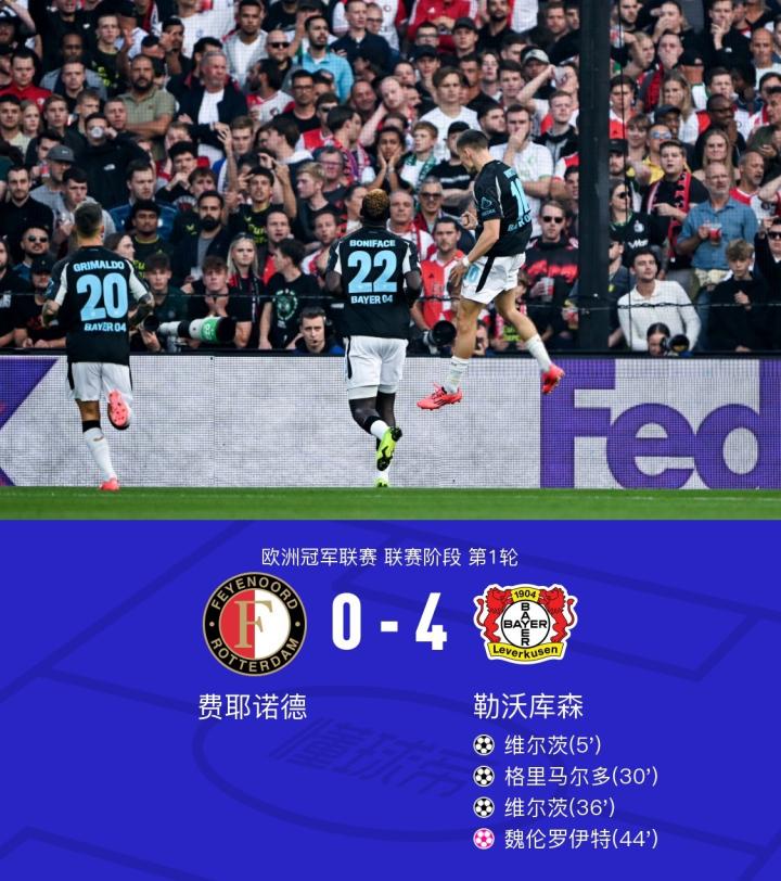 在欧洲冠军联赛小组赛首轮的较量中,费耶诺德迎战勒沃库森。上半场,维尔茨开场不久带球推进远射破门,泽鲁基门前劲射得手被判越位进球无效,弗林蓬助攻格里马尔多包抄破门,弗林蓬再次助攻维尔茨上演梅开二度,塔普索巴头球造成魏伦罗伊特黄油手;下半场,上田绮世包抄破门因越位被判无效,博尼费斯和格里马尔多均尝试中场吊门打偏。最终,勒沃库森以4比0大胜费耶诺德。