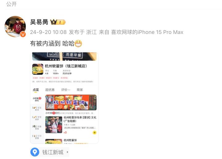 吴易昺因伤退赛,微博晒出杭州软蛋饼店图片并配文:有被内涵到爱看体育的小溜 @懂球帝2024-09-20 14:57昨日,吴易昺在家门口的ATP杭州站比赛中因伤退赛,无缘次轮。今日上午,吴易昺在微博中晒出杭州软蛋饼店的图片并配文:“有被内涵到,哈哈。”这篇微博被许多网友理解为是吴易昺的自嘲。在昨日因伤退赛后的采访中吴易昺说道:“我真的很抱歉没能在家乡给大家呈现更好的网球,真的很遗憾。但是可能我更对不起自己,我也不知道事情怎么会变成这样子,希望下次更好吧。”展开更多