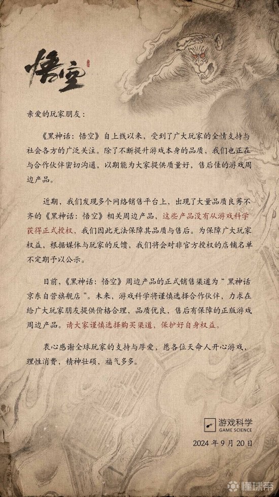 《黑神话:悟空》自上线以来,受到了广大玩家的全情支持与社会各方的广泛关注。除了不断提升游戏本身的品质,我们也正在与合作伙伴密切沟通,以期能为大家提供质量好,售后佳的游戏周边产品。