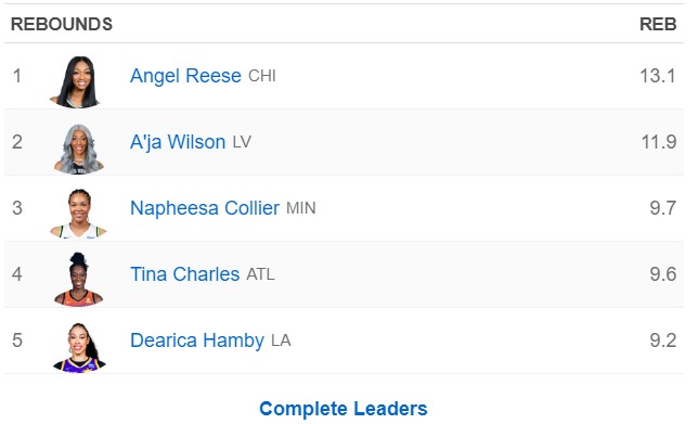 在篮板数据中,排在第一的是芝加哥天空的安吉尔-里斯,场均抢到13.1次篮板,在此之后的是拉斯维加斯王牌的阿贾-威尔逊,明尼苏达山猫的娜菲莎-科利尔。