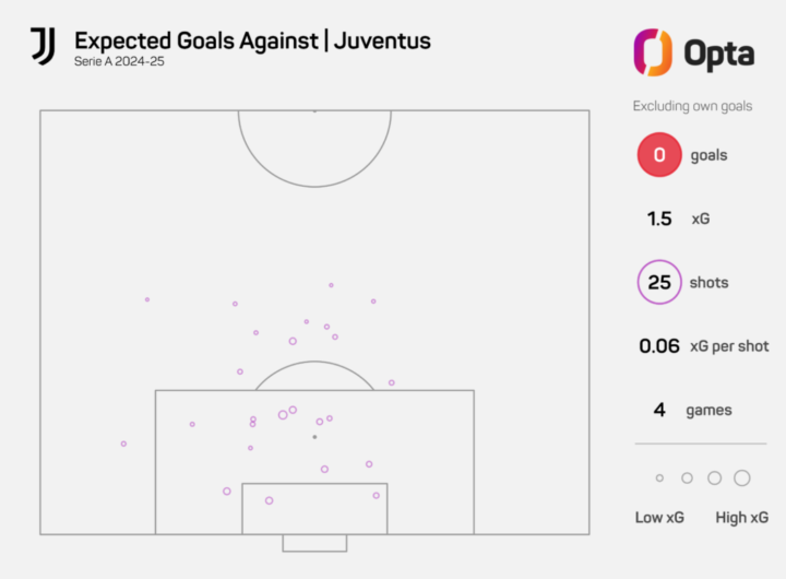 除此之外,所有联赛对手在对阵尤文图斯时只完成了5次射门,他们的预计失球数(1.5)在欧洲主流联赛范围内也是首屈一指的。他们在禁区内只允许对手触球47次,相关数据在意甲排名第一,在五大联赛也仅次于赫塔菲(38)和拜仁慕尼黑(39)。