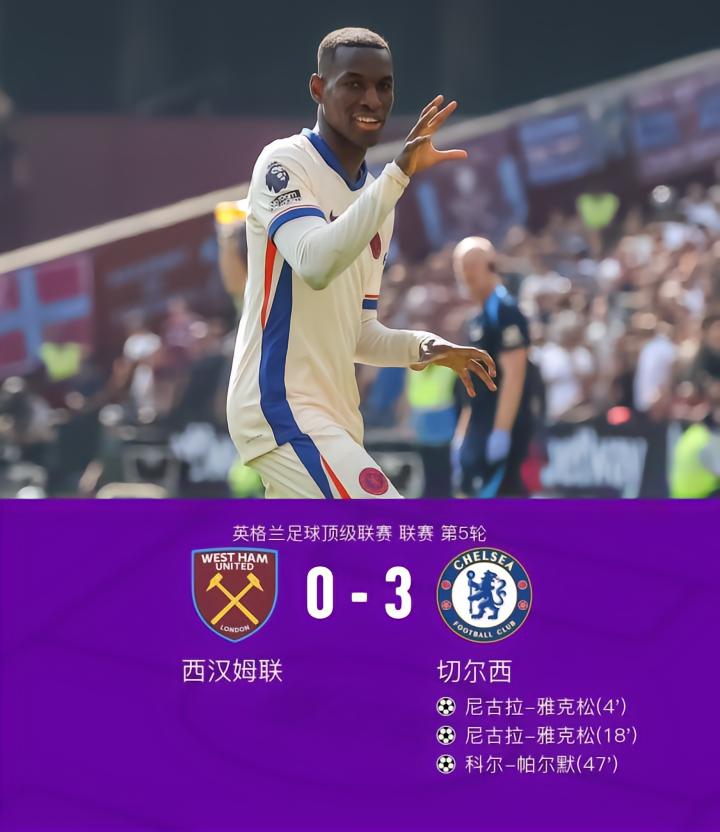 在英格兰足球顶级联赛第5轮的比赛中,西汉姆联主场迎战切尔西。比赛中,切尔西展现了强大的进攻火力。首先,桑乔助攻雅克松打入一球,为切尔西取得领先。随后,凯塞多再次送出精准传球,雅克松梅开二度,进一步扩大了比分优势。下半场,雅克松继续表现出色,助攻帕尔默破门得分。最终,切尔西以3比0战胜西汉姆联,取得了一场重要的胜利。
