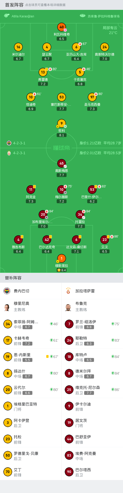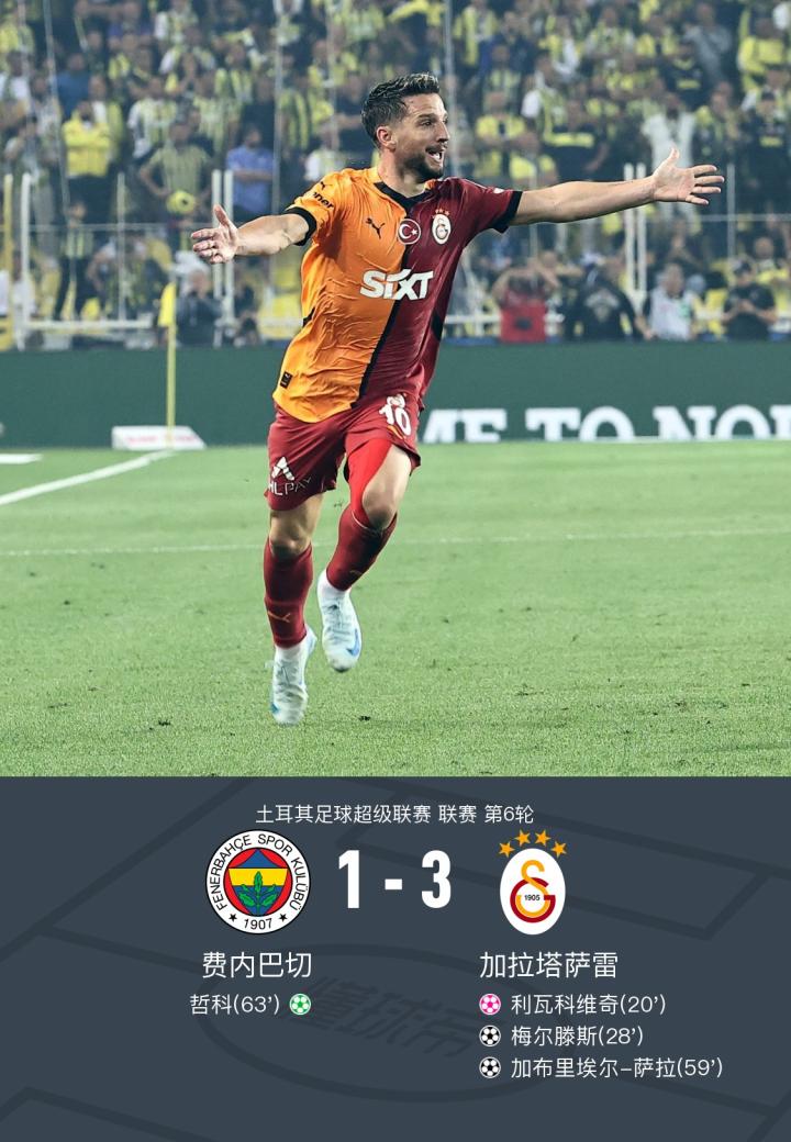 在土耳其足球超级联赛第6轮的比赛中,费内巴切主场迎战加拉塔萨雷。上半场,托雷拉抽射造成利瓦科维奇自摆乌龙,奥斯梅恩助攻梅尔滕斯扩大比分。下半场,托雷拉助攻萨拉兜射建功,哲科点射扳回一分,最终,费内巴切1-3不敌加拉塔萨雷。