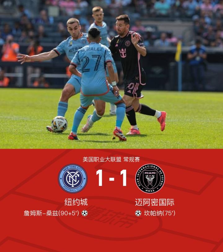 迈阿密国际1-1遭纽约城绝平,梅西送关键传球,坎帕纳建功