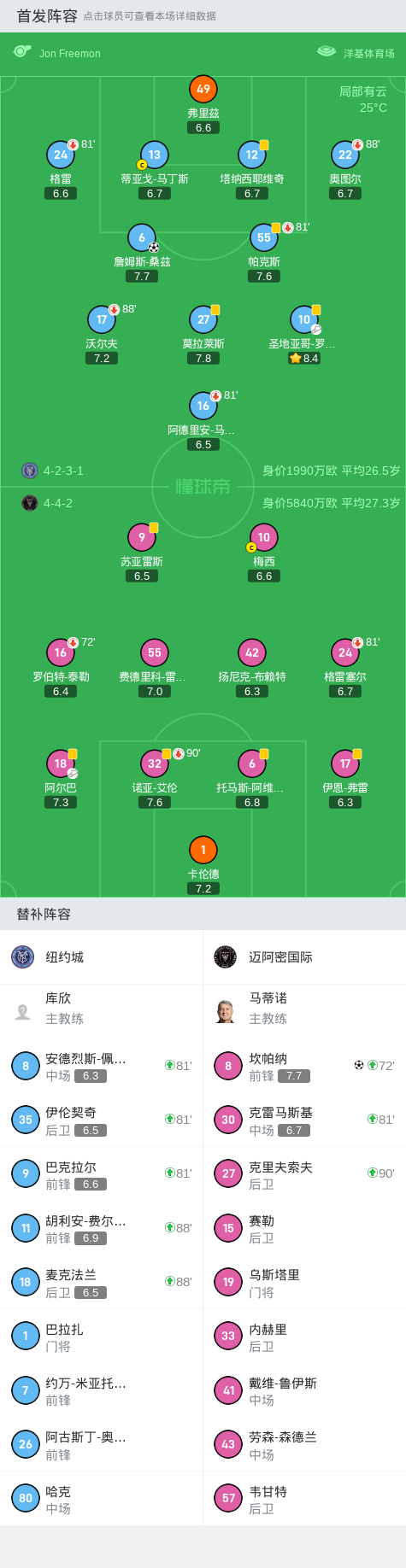 北京时间9月22日,美国职业大联盟常规赛,纽约城主场迎战迈阿密国际。上半场,梅西任意球打偏,圣地亚哥-罗德里格斯任意球击中立柱,苏亚雷斯抽射被门将扑出。下半场,梅西送出关键传球,阿尔巴助攻坎帕纳破门,詹姆斯-桑兹读秒绝平,最终,迈阿密国际1-1战平纽约城。
