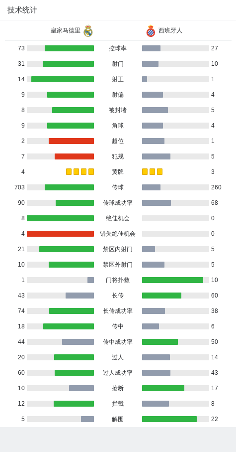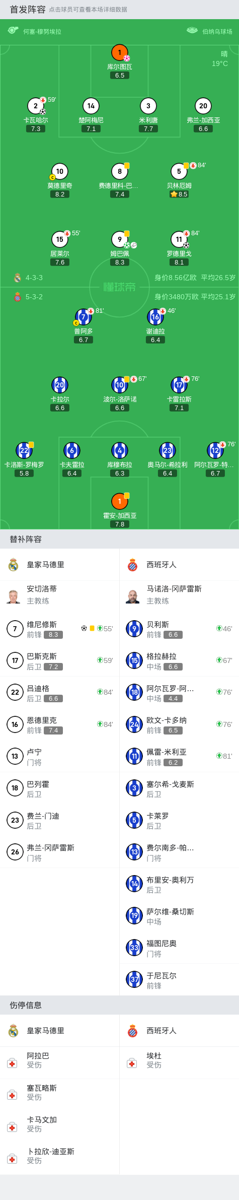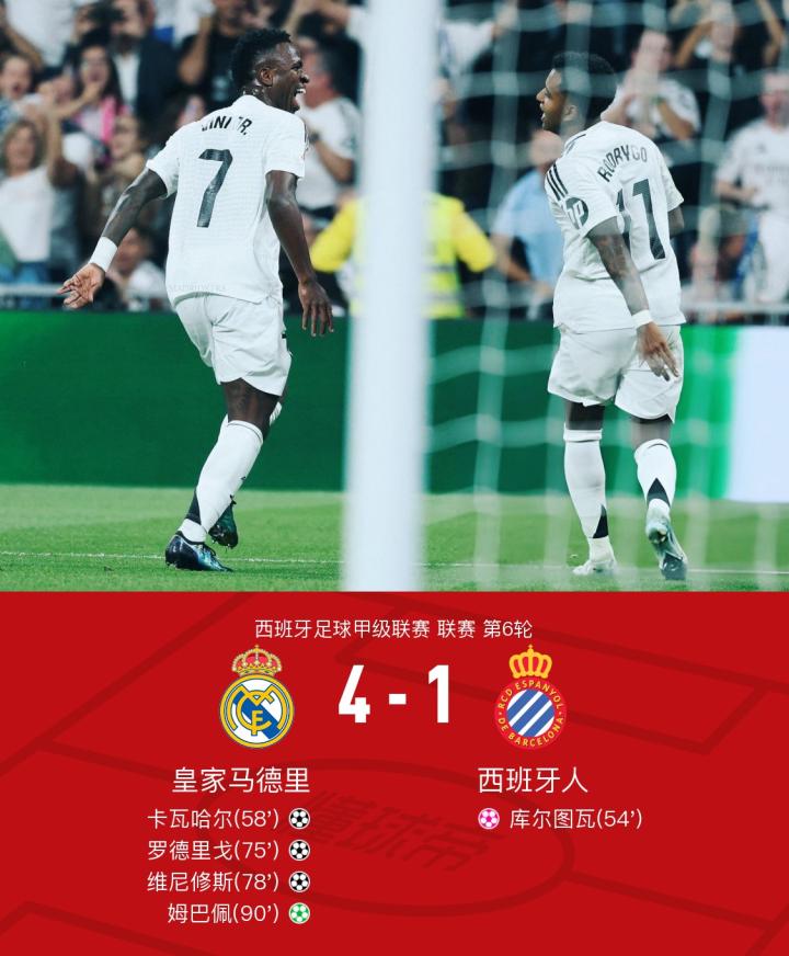 在西班牙足球甲级联赛第6轮的比赛中,皇家马德里主场迎战西班牙人。上半场,两队均无建树。下半场,库尔图瓦不慎自摆乌龙。不过,卡瓦哈尔门前捡漏很快扳平比分。维尼修斯外脚背风骚助攻,罗德里戈垫射反超比分。姆巴佩助攻,维尼修斯破门锁定胜局。终场前,恩德里克造点,姆巴佩主罚命中。全场比赛结束,皇马主场4-1逆转西班牙人。