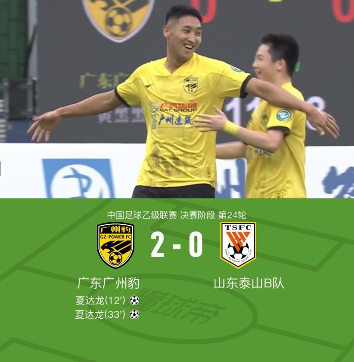 北京时间9月22日,中国足球乙级联赛决赛阶段第24轮,广东广州豹主场迎战山东泰山B队。比赛中,广东广州豹的夏达龙推射+中场吊射神仙球完成梅开二度。最终,广东广州豹以2-0战胜山东泰山B队,夺得本赛季中乙冠军。