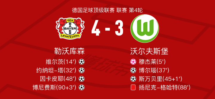 勒沃库森vs沃尔夫斯堡球员评分:维尔茨9.0分,弗兰克斯5.2分