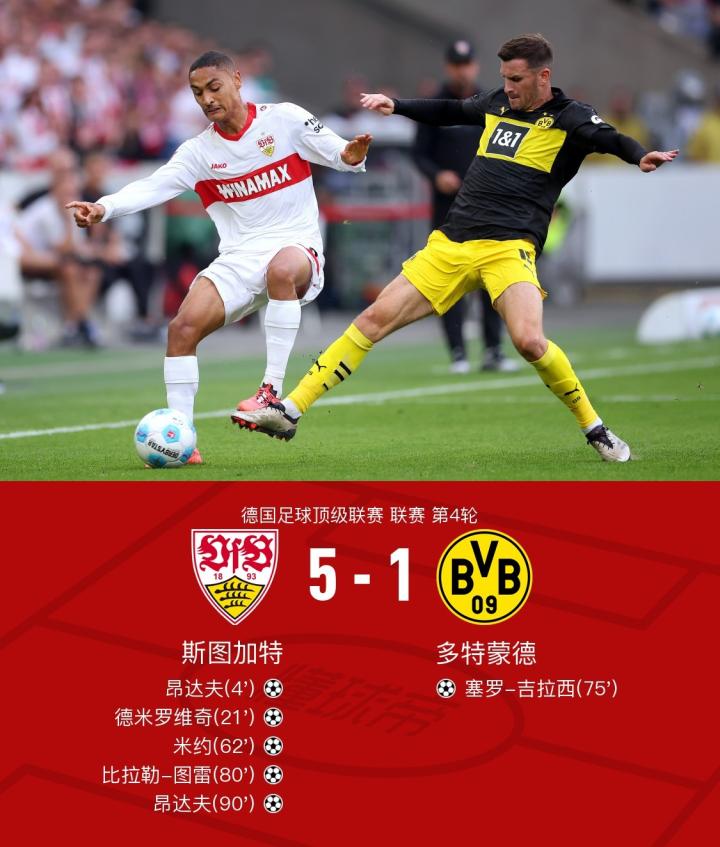 在德国足球顶级联赛第4轮的比赛中,斯图加特主场迎战多特蒙德。比赛上半场米特尔施泰特助攻昂达夫完成闪击,随后米特尔施泰特再次助攻德米罗维奇头球破门扩大比分,下半场卡拉佐尔传后点,米约垫射完成破门,吉拉西突破扎加杜后推射穿裆破门帮助球队扳回一城,比赛尾声米约底线突破送助攻,比拉勒-图雷打入德甲首球,补时阶段昂达夫低射远角破门锁定比分,全场战罢,最终斯图加特以5-1大胜多特蒙德。