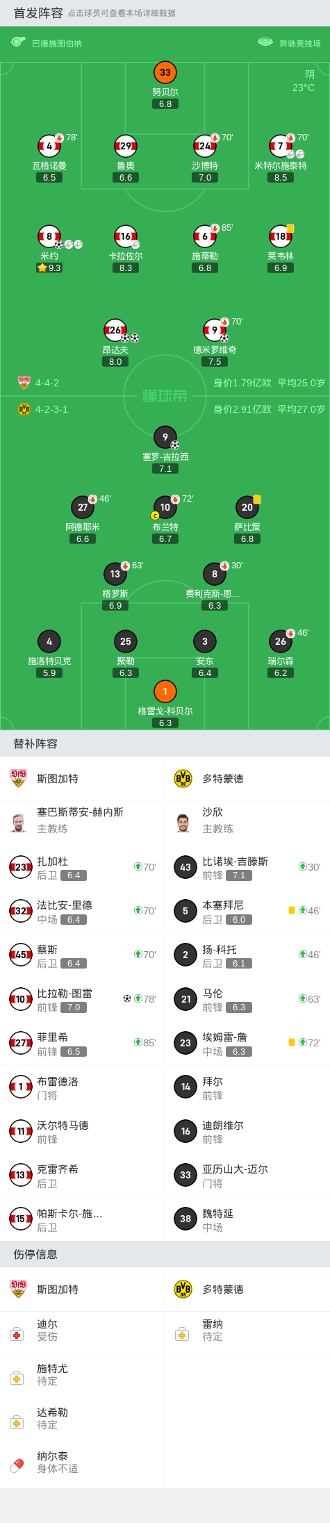 第21分钟,中路大空档,德米罗维奇轻松头球冲顶破门,多特0-2斯图加特