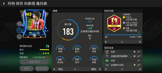 现效力于法甲尼斯的丹特是球队的队长。职业生涯中,他曾跟随拜仁收获过欧冠冠军,是一位实力派后卫。游戏中,像素大作战系列丹特配备了叹息之墙天赋,对他的多项防守数据有显著提升,这让他实战中的防守表现更加稳定。