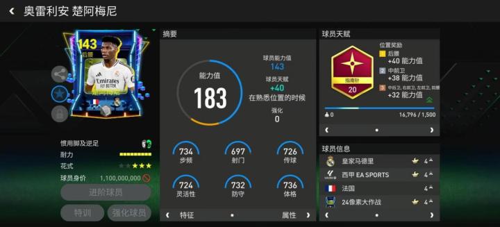 在摩纳哥时期,楚阿梅尼就展现出了十足的天赋,加盟皇马后,他的表现日臻成熟。像素大作战系列楚阿梅尼配备了指南针天赋,这让司职后腰的他盘带表现和传接球效果都有很大提升,搭配强壮的身材,他的整体表现相当全面。