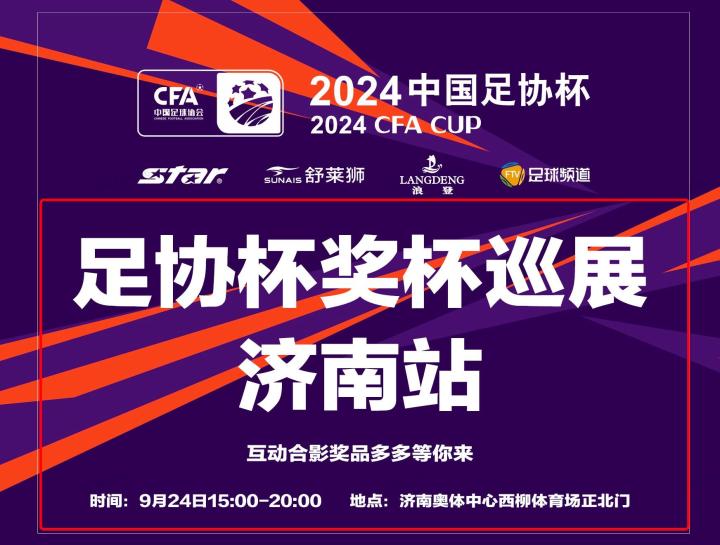 2024中国足协杯奖杯巡展在继云南曲靖、陕西渭南、云南玉溪、天津和上海之后,将会在半决赛之际来到“泉城”济南,9月24日下午将在济南奥体中心西柳体育场正北门进行巡回展出。